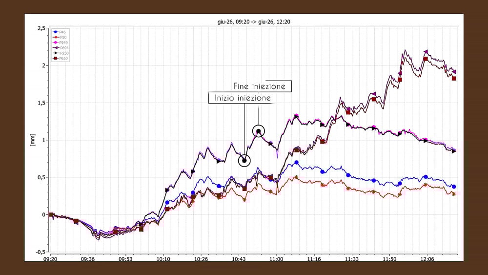 4. Alla fine delle operazioni di consolidamento il sistema è in grado di mostrare un grafico complessivo e cumulativo dell'azione dell'intervento URETEK Deep Injections con monitoraggio radar 3D nei punti di maggiore interesse.